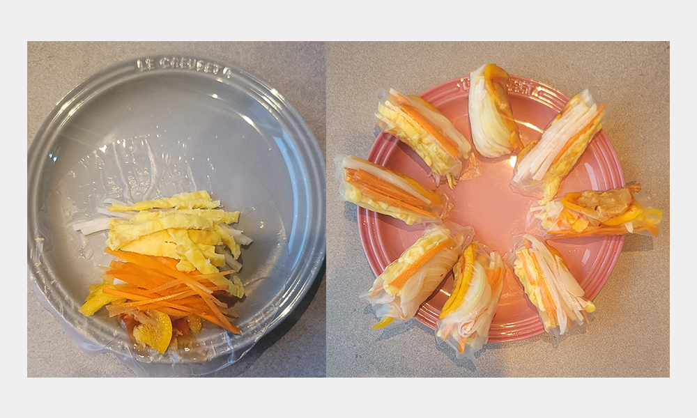 1. 미지근한 물에 라이스페이퍼를 담궜다 꺼내주고, 접시에 펴주어요.